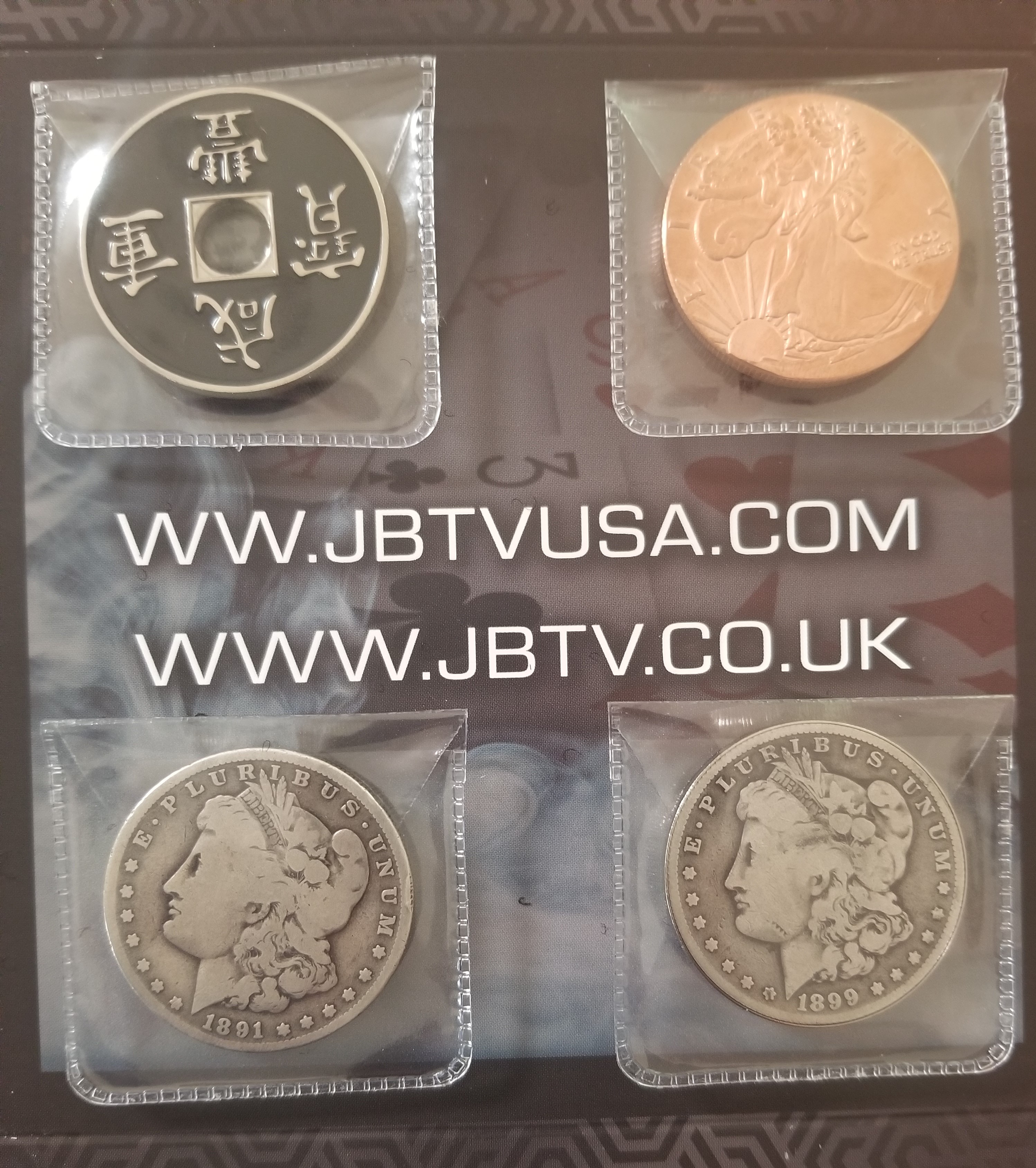 We now have the classic coin transposition in Morgan Dollar sets. We have had our very own Dollar size Chinese coins manufactured. These are top quality sets. Each set is handcrafted. This has to be one of the finest coin tricks ever created. Once again our in house coin expert has made several small changes to this set, making it a set to treasure.