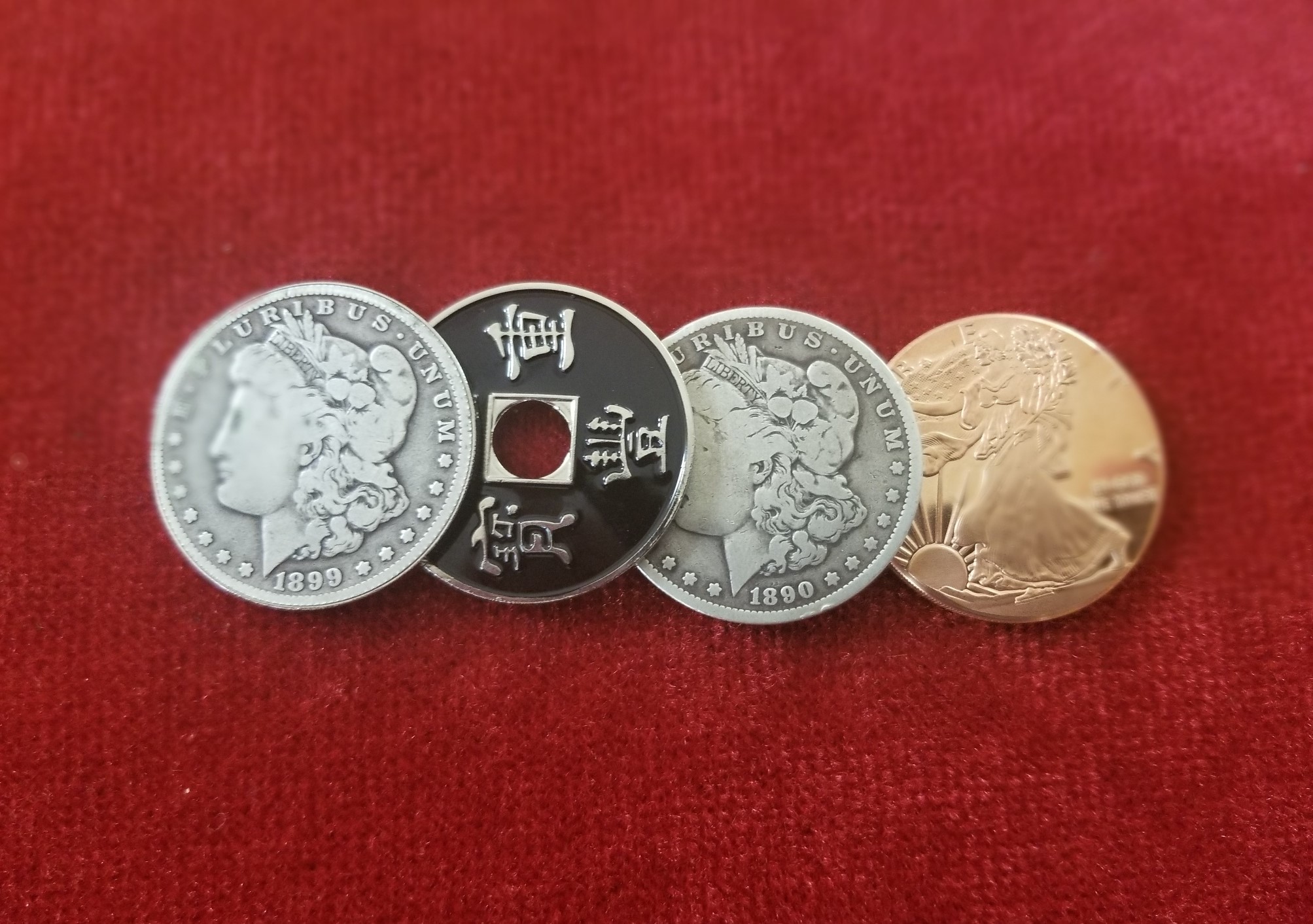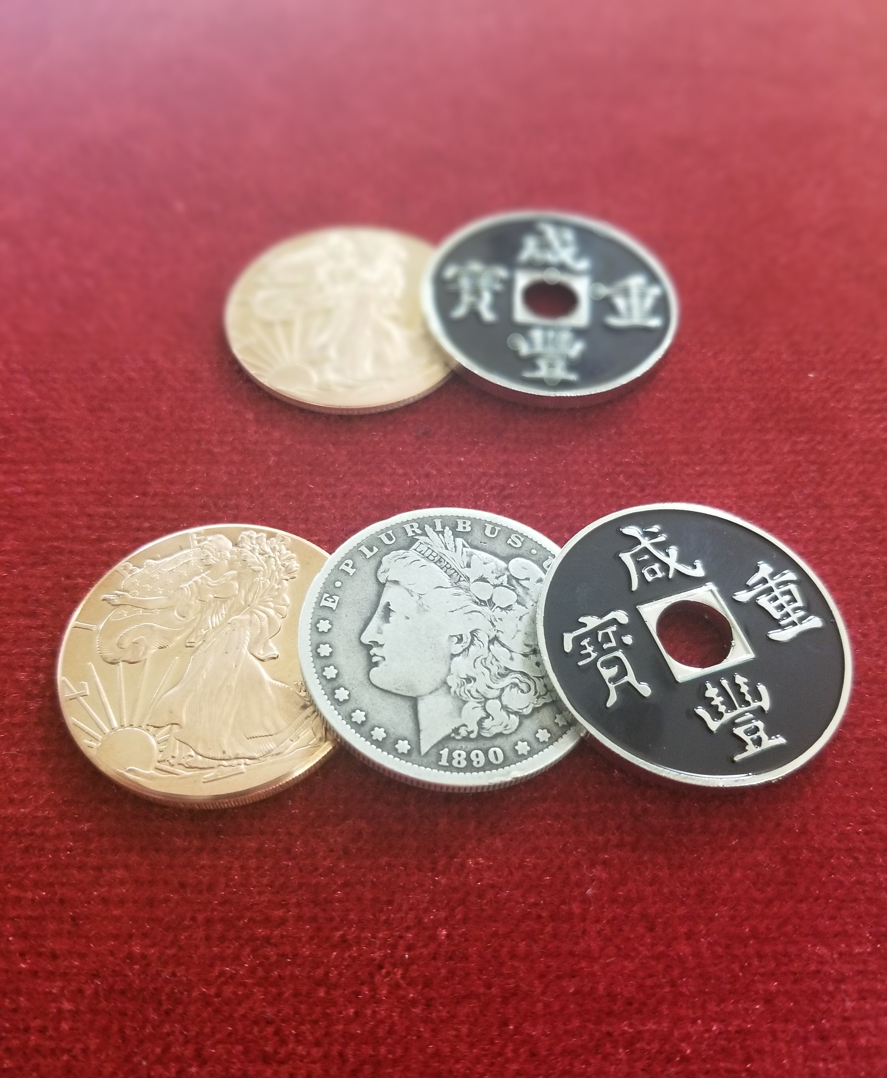 PLUS ALL 3 MATCHING COINS. 1 X DOLLAR SIZE CHINESE COIN, 1 X MORGAN DOLLAR, 1 DOLLAR SIZE COPPER COIN.